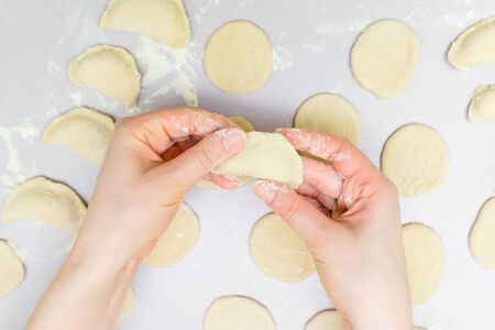 Hands are cooking Homemade Ukrainian traditional dish dumplings.