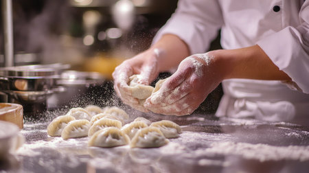 A skilled chef expertly prepares fresh dumplings, showcasing the delicate process of crafting dough. Flour dust surrounds the hands in action, emphasizing culinary artistry.