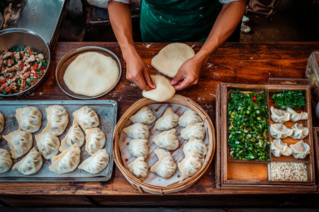 In a lively market kitchen, hands expertly knead dough and shape dumplings. Fresh ingredients await alongside an array of vibrant fillings. A vibrant culinary moment unfolds.