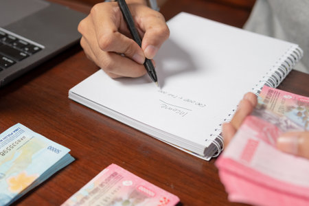 Close up of woman hand counting money uang Indonesian rupiah and making notes, money financial management concept
