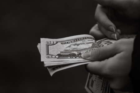 Selective focus on detail of USD banknotes. Counting or giving United States Dollars banknotes. World money concept, inflation and economy concept