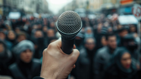 Close-up of a microphone against a blurred background of a crowd at a street demonstration