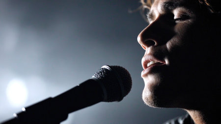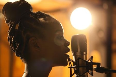 Profile view of a woman singing into a mic, with warm backlight creating a silhouette