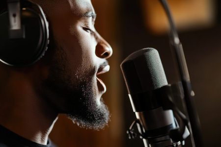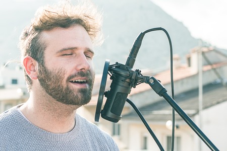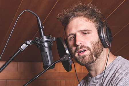 attractive bearded Caucasian man with headphones singing into the microphone medium closeup room background music concept. High quality photo