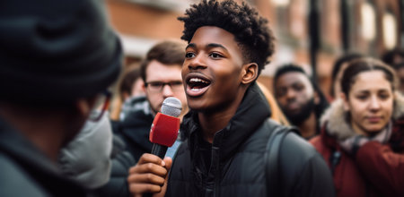 Group of protesters with their fists raised up in the air. Activists protesting on the street. People publicly demonstrating opposition. Gloomy city scenery. Generative AI.