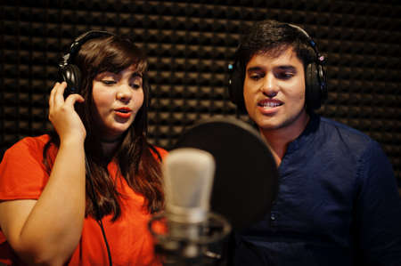 Two young singers performing song in record studio.Professional musician duet recording new album CD.Beautiful couple working and singing near microphone together.