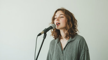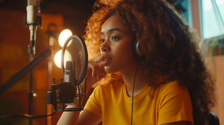 Young woman with curly hair is singing a song, performing with microphone in recording studio, expressing emotion and passion through music