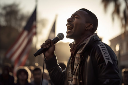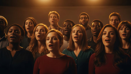 A striking image of passionate vocalists performing in harmony, showcasing emotion and connection, illuminated by stage lights, capturing the essence of live music and community spirit.