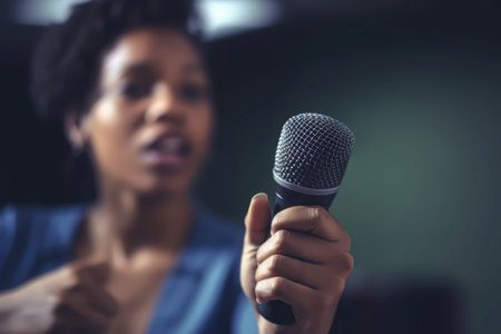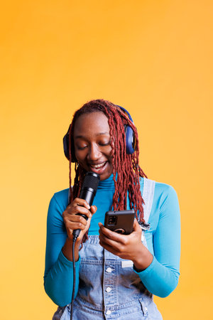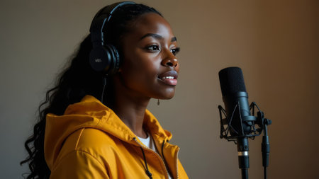 Stock photo of beautiful black woman singing and using microphone in music studio.