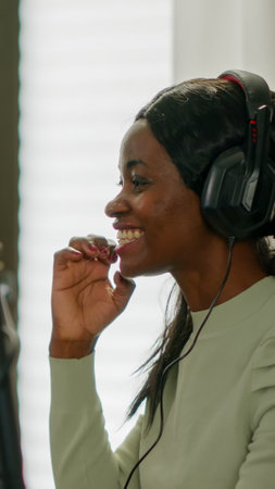 Good looking young black female making an online podcast recording for her online show. Attractive millennial African American business woman using headphones in front of microphone for radio program.