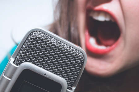 microphone/voice recorder closeup on a background of a singing girl with red lipstick