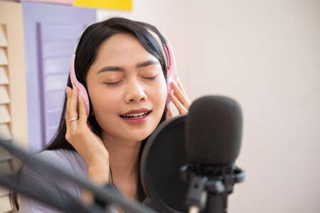 Happy cheerful pretty smiling of portrait young Asian woman vocalist Wearing Headphones taking a selfie with smartphone while recording a song front of microphone in a professional studio