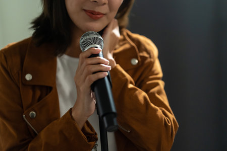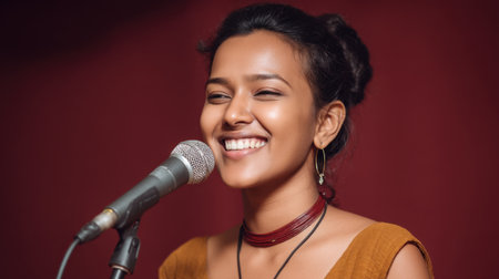 A joyful woman stands confidently at a microphone, radiating happiness while singing. The warm lighting enhances the vibrant atmosphere during her lively music performance.