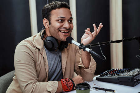 Portrait of happy young male radio host smiling while speaking in microphone, moderating a live show