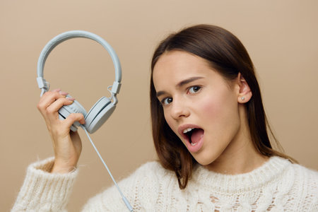 a funny woman in a white sweater stands fooling around with headphones holding them near her face