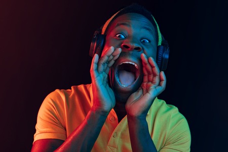 The young handsome happy hipster man listening music with headphones at black studio with neon lights. Disco, night club, hip hop style, positive emotions, face expression, dancing concept