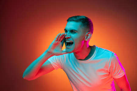 Portrait of young Caucasian man in casual clothes isolated over gradient red orange studio background in neon light with copyspace for ad. Concept of human emotions