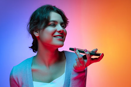 Happy young pretty girl in warm gray cardigan with phone isolated on gradient blue orange neon background