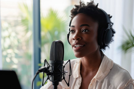 African American woman podcaster recording with a microphone in a bright, plant-filled room.