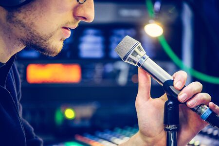 Young man is sitting in the recording studio and talks into the microphone, buttons and equipment in the blurry background