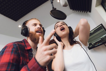 A man and a woman sing a song in a modern recording studio. On the man is a red checked shirt, on a woman a white T-shirt.