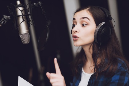 The girl in the recording studio sings a song. Her headphones are on her head. Next to her is a microphone. She emotionally sings the song.