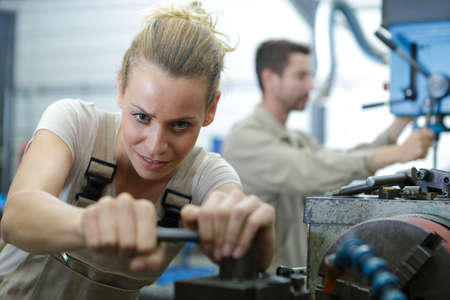 Female apprentice in metal working factory, Portrait of working female industry technical worker or engineer woman working in an industrial manufacturing factory company.