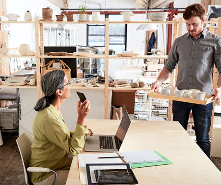 Close up view of female office worker using smartphone while working in meeting room with colleague