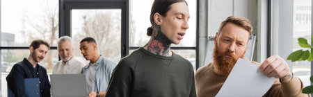 Unemployed, bankrupt. Four sad young adult men with placards in hands standing silently in office corridor