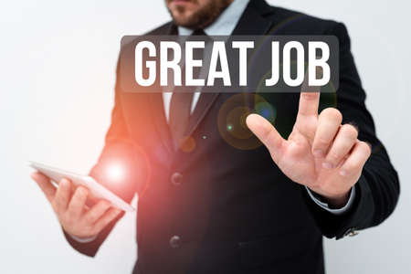 Conceptual caption Great Job. Concept meaning used praising someone for something they have done well Presenting New Technology Ideas Discussing Technological Improvement