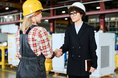 Young confident female manager of factory in formalwear and protective helmet shaking hand of engineer after making agreement