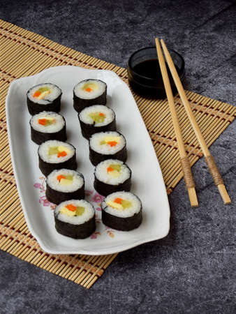 Seaweed sushi on plate has chopsticks on brown background close up, top view