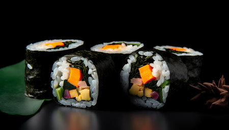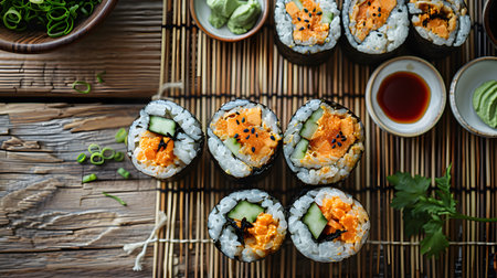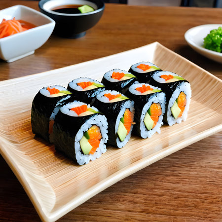 Japanese Cuisine Displaying Sushi Rolls with Toppings