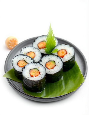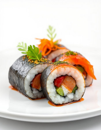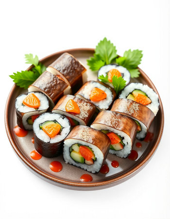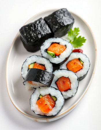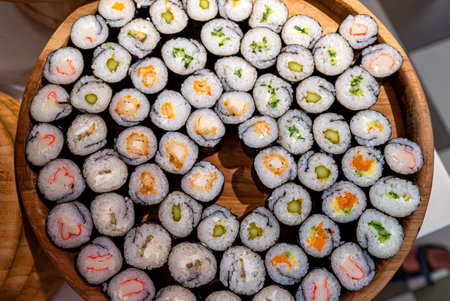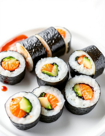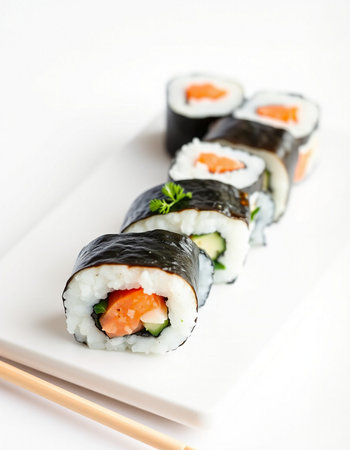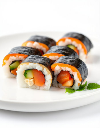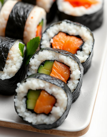 A vibrant plate of fresh sushi rolls showcases a delicious assortment, perfect for a meal or snack. Ideal for food photography and culinary themes.