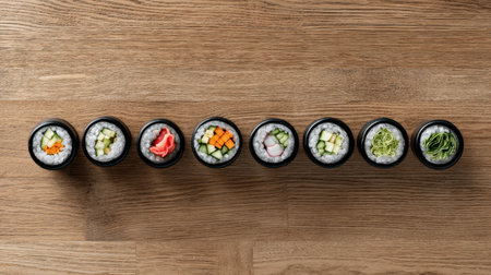 An artistic display of colorful sushi rolls arranged in a straight line on a wooden surface, capturing the essence of Japanese cuisine and fresh ingredients.