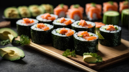 Fresh seafood maki sushi plate with avocado generated by artificial intelligence