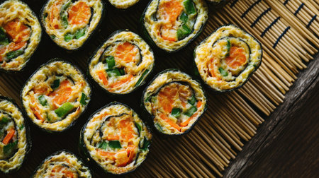 A vibrant assortment of sushi rolls arranged on a bamboo mat. This appetizing display features a mix of fresh ingredients and colorful vegetables, perfect for any meal or snack.