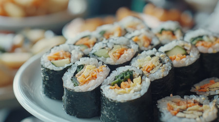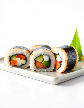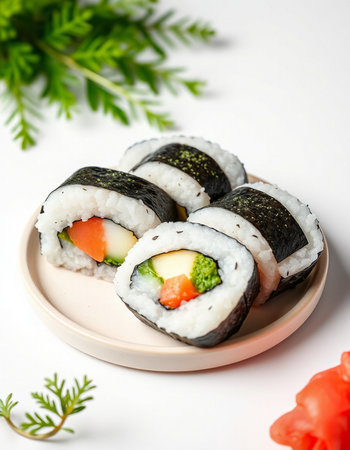 Fresh kimbap rolls with colorful vegetables on white rectangular plate in bright minimalist kitchen with natural sunlight.