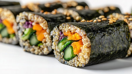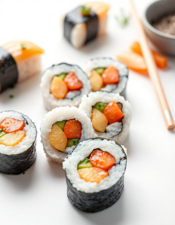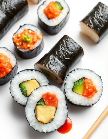 A close-up of delicious sushi rolls featuring vibrant colors and fresh ingredients. Perfect for showcasing Asian cuisine in food-related contexts.
