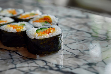 Kimbap or Gimbap with salmon and vegetables on a marble background. Korean food