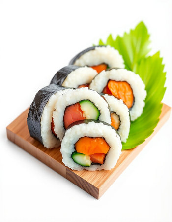 Close-up of sushi rolls with cucumber and carrot on a wooden cutting board