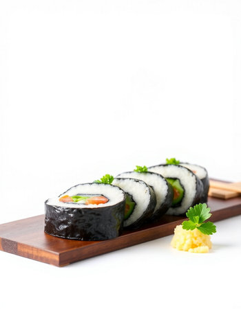Sushi rolls on a wooden plate with chopsticks on a white background