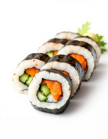 Sushi rolls on a white background. Sushi roll with cucumber, salmon, avocado and sesame seeds.