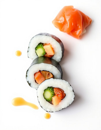 Enjoy a beautifully presented plate of fresh sushi rolls, garnished with pickled ginger and wasabi, perfect for a flavorful dining experience.