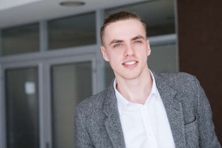 Face portrait of attractive joyful young caucasian mixed race man in business formal suit smiling and posing near modern buildings outside. Businessman. Ethnicity