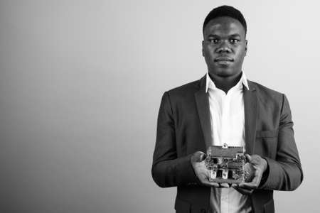 Studio portrait of serious unemotional young black man with stubble on shaved face. Headshot of African American university student, businessman or white collar worker looking at camera
