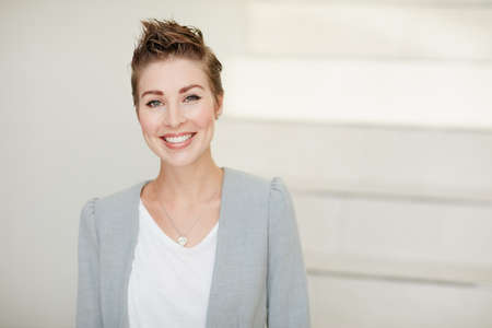Portrait of young blonde businesswoman in gray suit walking in the city