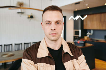 A man with a short haircut and a neutral expression poses in a beige shirt against a white background.