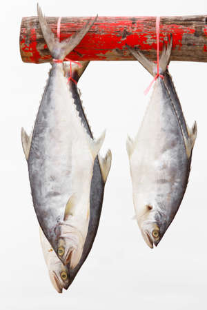 Sea fish, hang to dry on a wooden railing.