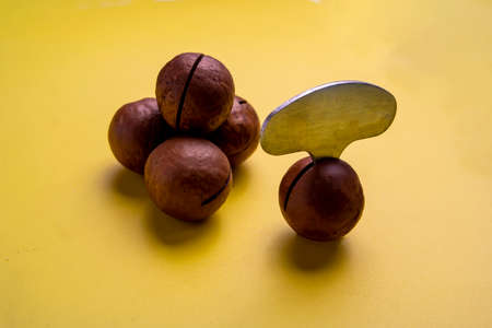 a few macadamia nuts lie on a yellow background. A key for opening nuts is inserted in one of them.